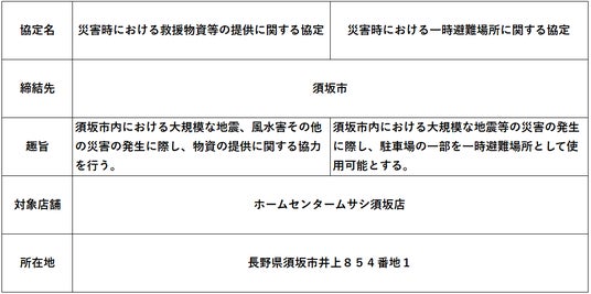 アークランズ株式会社(社長:佐藤 好文、新潟県三条市)は、12月18日(木)に須坂市(長野県須坂市)と「災害時における救援物資等の提供に関する協定」および「災害時における一時避難場所に関する協定」を締結したことをお知らせいたします。