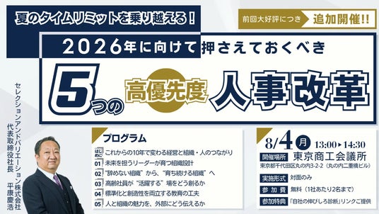 組織・人事コンサルティングファームであるセレクションアンドバリエーション株式会社(以下、当社、東京都千代田区丸の内、大阪市西区、名古屋市西区 / 代表取締役社長:平康慶浩/ URL: https://sele-vari.co.jp/ )は『【前回大好評につき追加開催】【東京開催リアルセミナー】夏のタイムリミットを乗り越える!2026年に向けて押さえておくべき5つの高優先度人事改革』を2025年8月4日(月)13:00~14:30に開催することをお知らせいたします。