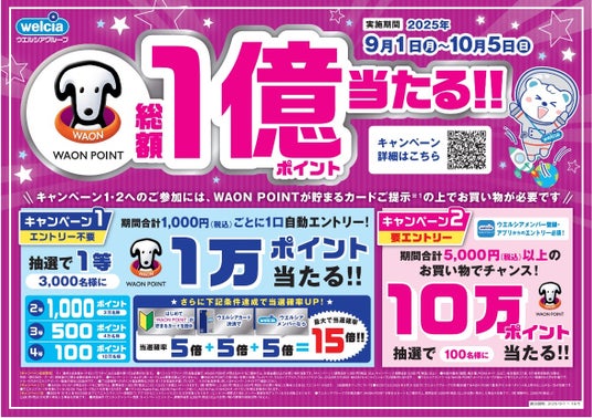 ウエルシア薬局株式会社(本社:東京都千代田区、代表取締役社長:田中純一、以下 ウエルシア薬局)は、2025年9月1日(月)より、「WAON POINT総額1億ポイント当たる!!」キャンペーンをスタートします。