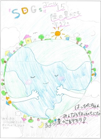 このキャラクターは、植木小学校6年生の横山咲愛さんがSDGsゴール15「陸の豊かさも守ろう」をテーマに描いたもので、上半分には太陽を、下半分には月を浮かべて、その真ん中には動物や草木があふれ優しくほほ笑む地球が描かれています。