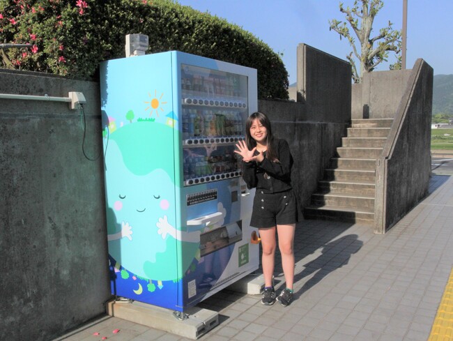 来庁者用駐車場の自動販売機と植木小学校6年生の横山咲愛さん