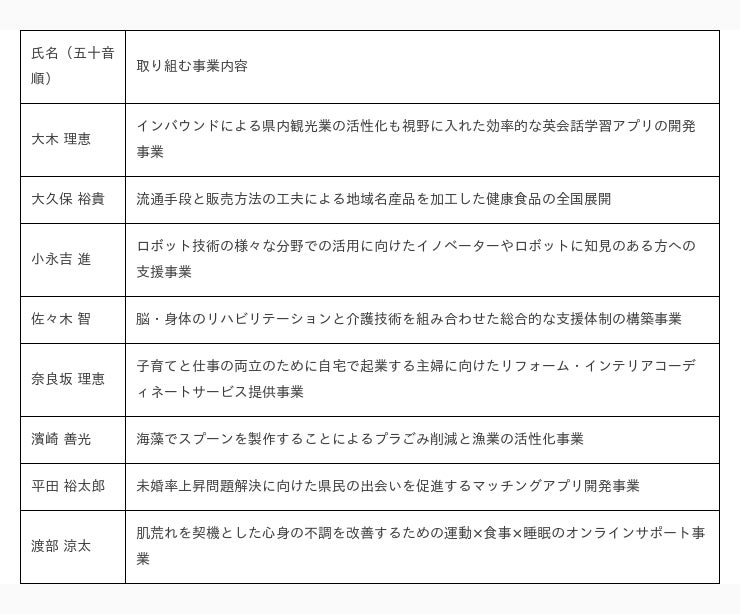県では、地域発の起業家を次々と生み出す「HATSU起業家支援プログラム」により、起業を目指す有望な起業準備者“チャレンジャー”を募集・選考の上、起業の実現に向けて約7か月間の伴走型集中支援を実施しています。 このたび、起業家創出拠点「AGORA Hon-atsugi」において、県が支援する令和5年度「AGORA Hon-atsugiチャレンジャー」8名を決定しましたので、お知らせします。