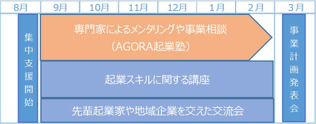 令和5年8月下旬から令和6年3月までの約7カ月間にわたって、起業に必要なスキルが学べる講座をはじめ、専門家によるメンタリングや事業相談、先輩起業家や地域企業との交流機会を提供します。チャレンジャーは、各種支援を受けて、新規売上や法人登記、資金調達の実現、製品・サービスのテスト版の開発など、事業化着手に取り組みます。 なお、支援期間中は「AGORA Hon-atsugi」のワークスペース等が無料で利用できます。