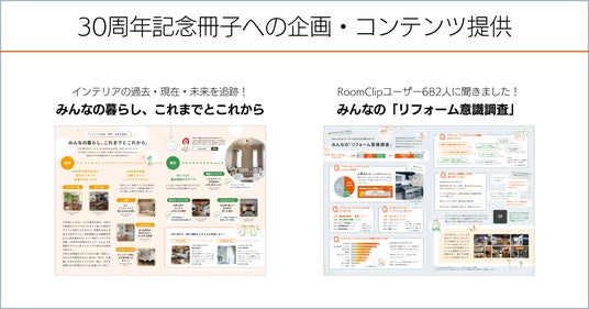 それに伴い、当社とエー・ビー・シー開発株式会社は、事前に当社が運営する住まいと暮らしに特化した日本最大級のソーシャルプラットフォーム「RoomClip」のユーザー682名に対して「リフォームに関する意識調査」を実施しました。30周年記念冊子と特設サイトでは、このアンケートの結果に加え、RoomClipに投稿された600万枚以上の住まいの写真とそれに基づくデータから読み解いた、インテリアの過去・現在・未来をご紹介します。