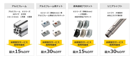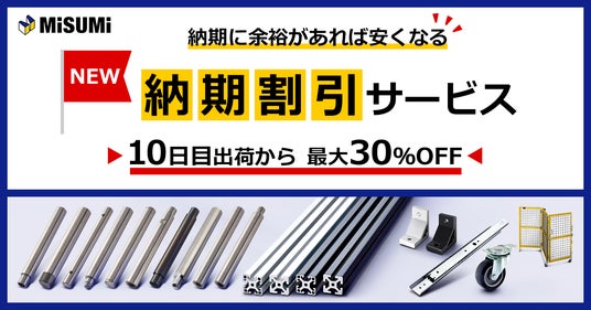 株式会社ミスミグループ本社(本社:東京都千代田区、代表取締役社長:大野龍隆)は、2024年7月より新たに、MISUMI ECサイトからのメカニカル部品ご注文時に納期10日目以上を選択いただくと、対象商品がご注文数量により最大30%オフとなる「納期割引サービス」の提供を開始します。これにより、納期に比較的余裕があるご注文に対し、1,000点以上の対象商品を低価格で購入いただけるようになります。なお、対象商品は順次拡大予定です。