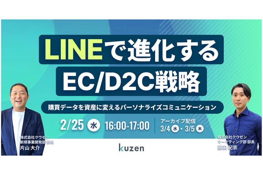 対話デザインプラットフォーム「クウゼン(KUZEN)」を提供する株式会社クウゼン(本社:東京都新宿区、代表取締役CEO:太田 匠吾、以下、当社)は、2026年2月25日(水)に、EC/D2C事業者様を対象としたウェビナー「LINEで進化するEC/D2C戦略~購買データを資産に変えるパーソナライズコミュニケーション~」を開催いたします。