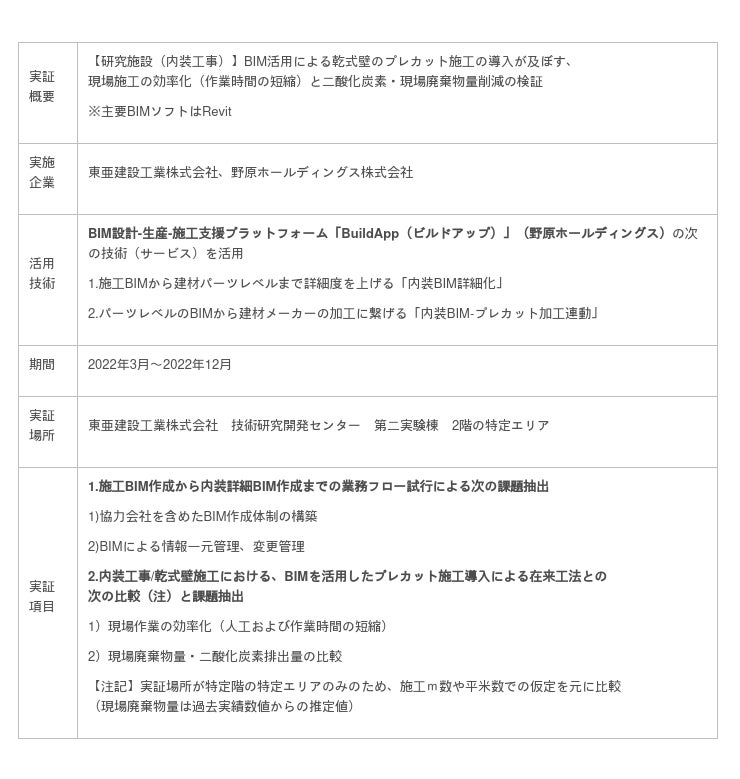 建設DXに取り組む野原グループの野原ホールディングス株式会社(所在地:東京都新宿区、代表取締役社長:野原弘輔)は、東亜建設工業株式会社(所在地:東京都新宿区、代表取締役社長 早川毅)と、研究施設の増築工事において、施工フェーズでのBIM活用による乾式壁のプレカット施工を導入し、現場施工の効率化(作業時間の短縮)と二酸化炭素・現場廃棄物量の削減効果を共同実証しました。