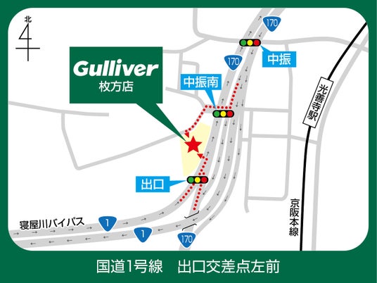 当店は、国道1号線と170号線が交差する「中振南交差点」付近に位置しており、大阪府内はもちろん、京都方面からのアクセスも良好です。さらに、京阪本線「光善寺駅」から徒歩圏内にあるため、おクルマを初めて検討される方にもご来店いただきやすい立地となっています。