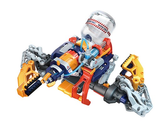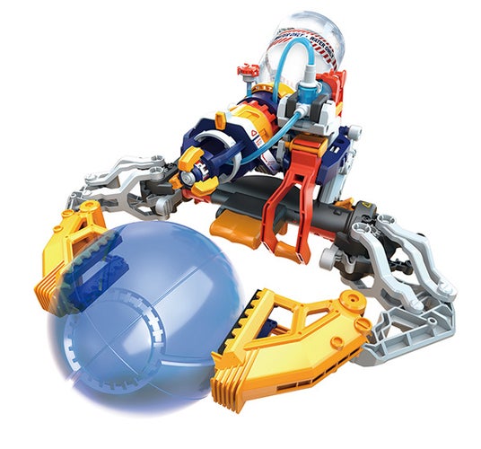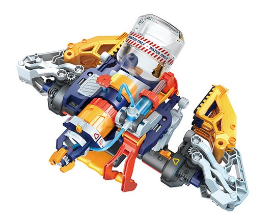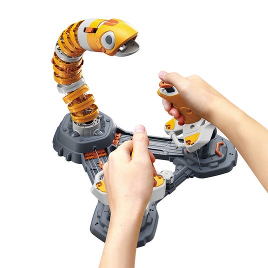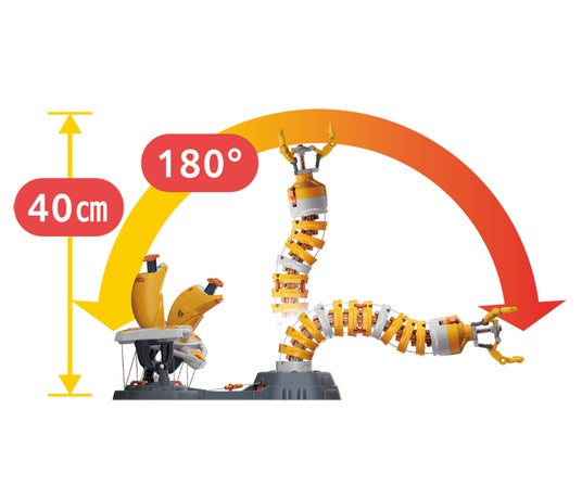 にょろっとアームのヘッドはグリップに交換でき、 3つのツメのロボットアームに変身します。付属のエビをパクっと食べたり、ボールをつかんで移動させたり等ボタンで操作できる乾電池不使用のバイオニックメカです。