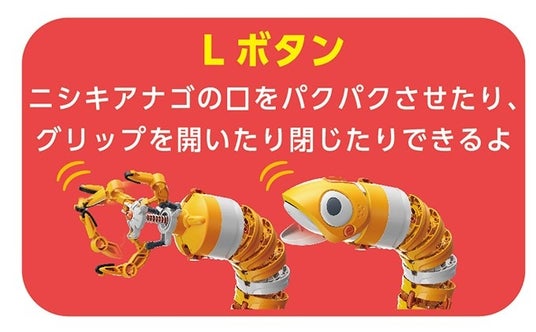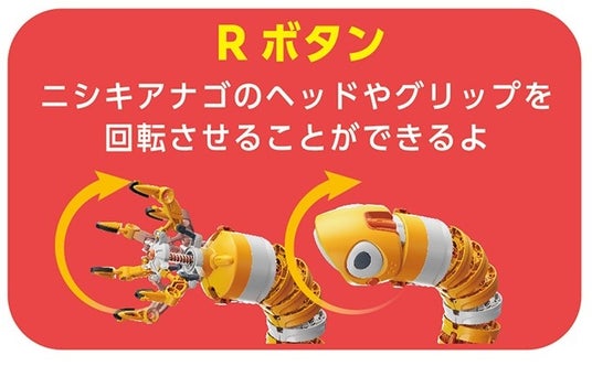 Rボタンはヘッドやグリップを回転することができ、Lボタンはニシキアナゴの口をパクパクさせたり、グリップを開いたり閉じたるする動作ができます。