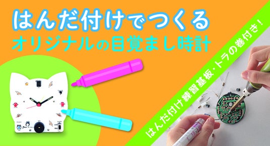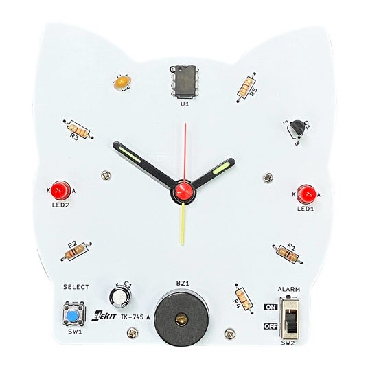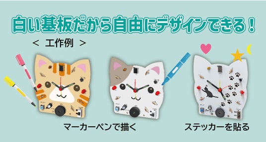 メロディクロック 2 作品例音と光で時間をお知らせするアラーム時計の組み立てキットです。音は4種類のメロディーと2種類のアラーム音から選べます。数字のかわりに電子部品を配置した動物形の白い基板は、マーカーペンなどで自由にデザイン可能。作って使って楽しい時計です。
