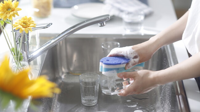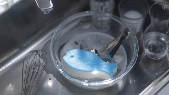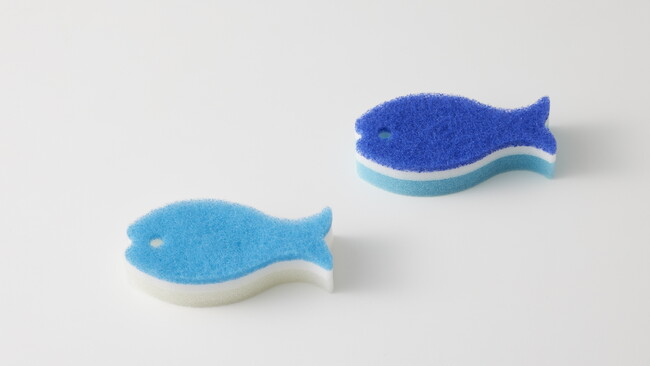 「おさかなスポンジ」はおさかなの形が手になじみ、握りやすいキッチンスポンジです。長めのサイズでコップの底まで届きます。ナイロン不織布・ウレタン・脱膜ウレタンの3層構造で、汚れ落ち、泡立ち・泡持ち、水切れにも優れています。「かわいいだけじゃなく使いやすい」と長くお客様に支持をいただき、発売から25周年を迎えました。