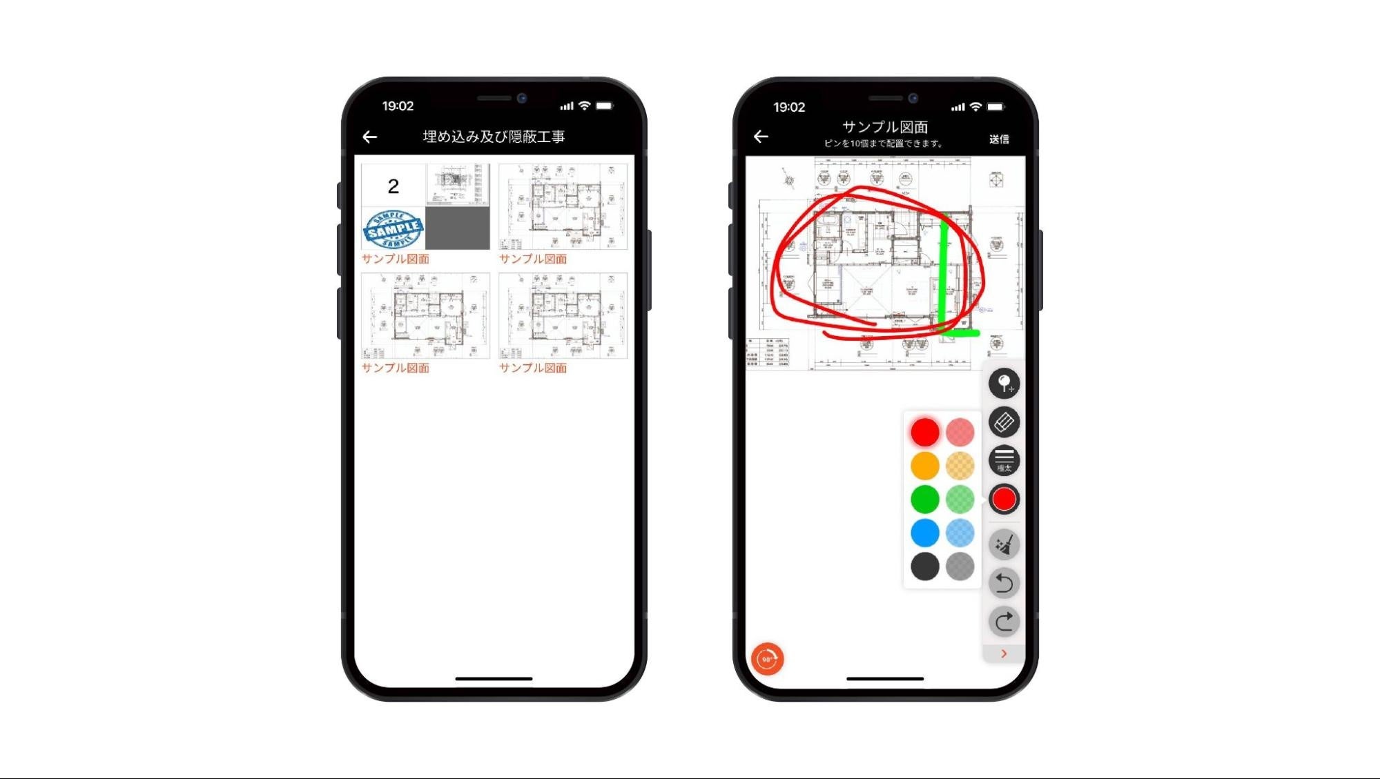 チャット上で共有している図面への書き込みなども可能です。言葉だけで説明することが難しい現場特有のコミュニケーションを容易にします。