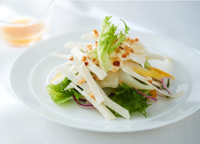 今回のテーマ素材は、兵庫県丹波篠山産の「山の芋」。見た目はげんこつのようにゴツゴツしていますが、表面をむくと内側は真っ白。きめが細かく、粘りが強いことが特徴です。その粘りと食感、ほんのりとした甘みを活かし、サラダとして仕上げた一品。生産量が少なくなかなか市場に出回らない「山の芋」を使ったサラダを、ぜひこの機会に味わってみてください。