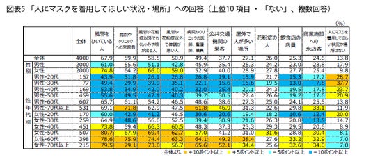 人にマスクを着用してほしい状況・場所では(図表5)、「風邪をひいている人」「病院やクリニックへの来院者」のほか、風邪や花粉症以外で「くしゃみや咳が出る人」「体調が悪い人」が過半数というのは納得です。性別でみると、図表4と同様に男性は周囲のマスク着用に対して寛容な傾向がある一方で、女性は50代以上を中心にマスク着用に対し依然として厳しい目を光らせているようです。