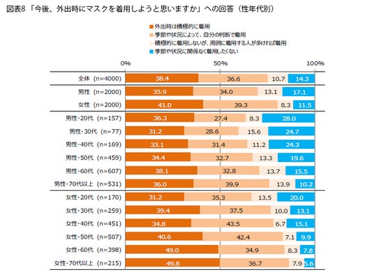 ここまでマスク着用の“過去”と“現在”を探ってきましたが、“未来”もみてみましょう。今後のマスク着用の意向についてたずねてみたところ(図表8)、「外出時は積極的に着用」が38.4%、「季節や状況によって、自分の判断で着用」36.6%と、ほぼ同率という結果になりました。程度の差はあれ、3分の2の人が今後もマスク着用を継続する意向のようです。また、「積極的に着用しないが、周囲に着用する人が多ければ着用」と、周囲の状況次第で着用する人も10.7%にのぼり、「季節や状況に関係なく着用したくない」(以下、「着用したくない」)と、かたくなな態度を示すのは14.3%となりました。性年代別にみると、「着用したくない」は男性40代以下と女性20代で2割を超えていますが女性50代以上では1割以下どまりに。対極の「外出時は積極的に着用」は男性全年代と女性40代以下は3割台ですが、女性50代以上では4割台、同70代以上では49.8%とほぼ半数と、マスク着用意向が高いようです。