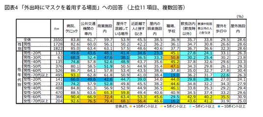 次に、外出時にマスクを着用する場面については(図表4)、83.8%と最も多くの人が挙げたのが「病院、クリニック」。マスク着用を義務付けている施設が多いことを反映してか、通院頻度が高まるシニア層である女性60代と男女70代以上で9割超に。これに、電車やバスなど「公共交通機関の車内」61.7%、スーパーなどの「商業施設内」59.7%、「屋外で混雑している場所」53.9%が続きました。不特定多数の人が多く集まる屋内や、屋外でも人が多い場所では半数以上がマスクを着けているようです。また同じ屋内でも、映画館など「屋内の娯楽施設」が「商業施設」より20ポイント以上低いのは、作品鑑賞中はしゃべることがないので不要、と考えてのことでしょうか。各項目で全般に女性を中心としたシニア層が高値を示すなか、男性30代の50.8%を筆頭に50代以下で4割超となったのが「職場、学校」というのは納得ですね。