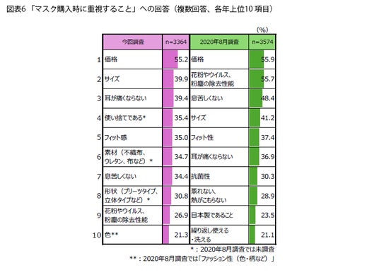 マスク購入時に何を重視するのか、マスク不足が叫ばれていた時期である2020年8月調査の結果と比較しながらその変化をみてみましょう(図表6)。トップは2020年も今回も「価格」で、比率もともに55%台となりました。消耗品であるうえ毎日使う人も少なくないことから、価格は重視せざるを得ない面はありますね。片や、2020年2位の「花粉やウイルス、粉塵の除去性能」と3位の「息苦しくない」は、今回は9位と7位に順位を下げたうえ、比率も各28.8・14.0ポイント低下しています。5年前に比べ感染の危険性が緩まったことや、コロナの5類移行で終日マスクを着用することが減ったことなどが背景にありそうです。一方、「耳が痛くならない」は6位→3位に順位を上げたうえ、比率も3ポイント上昇しています。マスクを長時間着用するほうが耳の痛さは気になりそうなものですが、マスクが店頭に十分にストックされ商品のバリエーションが豊富になった現在では、より快適性を求める人が増えているのかもしれません。前回調査では選択肢にありませんが、「素材」「形状」「色」が10位内に入っているのも、同様の理由によるものかもしれませんね。