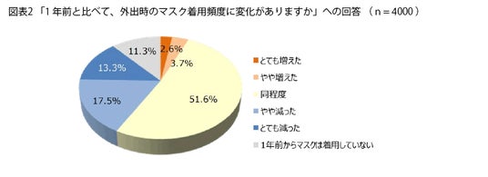 依然としてマスク派が多数派であるなか、1年前と比べたマスク着用頻度の変化をたずねたところ(図表2)、51.6%と半数強が「同程度」と回答。また6.3%が「増えた」(「とても」+「やや」)としており、マスクを着用しない人が周囲で増えたため自衛の意味で着用頻度を上げた、ということでしょうか。年代別では(図表非掲示)、「1年前からしていない」は男性30~50代、女性20代で17~20%台と全体に比べて高位でしたが、70代以上では男性6.8%、女性5.1%と、男女とも全年代で最低に。なお、「増えた」が19.1%と最も高かったのは意外(?)なことに20代男性でした。