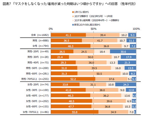 性年代別でみると、「新型コロナのまん延以前から」が男女とも20代が各30.6%・24.3%で最多となり、年代が上がるほどにその比率は低下する傾向がみられます。片や、「1年くらい前から」は逆に年代が上がるほどに上昇する傾向があり、男女とも70代以上では半数以上となりました。また、「1年くらい前から」と「コロナ5類移行~1年前」の比率を各年代で比較してみると、女性は全年代で前者のほうが高いですが、男性では30代~60代では後者のほうが高率に。働き盛りの男性はマスクを外せる日を待ちわびていたのかもしれませんね。