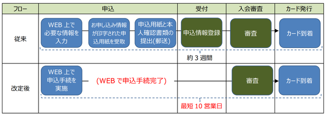 今後は、お支払い口座に三井住友銀行の法人口座を設定のお客さまについては、インターネット上で申込手続きを完了(※2)させることができます。また、申込情報の自動登録等の開発を行ったため、最短10営業日でカード発行が可能となります。