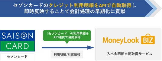 入出金明細自動取得サービス「MoneyLook BIZ」と、「セゾンカード」がAPI連携を開始したことにより、「セゾンカード」をお使いの企業はクレジットカードの利用明細や引落情報をタイムリーに自動取得することが可能になります。ワンクリックで「セゾンカード」のカード利用データを財務会計システムなどに取り込めるようになることで、「セゾンカード」の利用明細情報を取得するための手間や時間を削減でき、会計処理の早期化に貢献します。