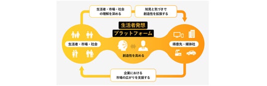 「生活者発想プラットフォーム」:生活者・市場への深い理解や、新しい発見・価値創造をAIとともに行い、AI×生活者発想でビジネスの拡大を支援する新しい発想支援基盤。
