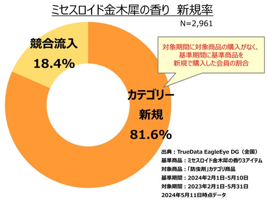 衣類用防虫剤「ミセスロイド」は、1988年に発売し、現在も多くの方にご愛用いただいているロングセラーブランドです。また、昨年秋に発売し多くの方にご支持いただいた『ミセスロイド 金木犀の香り』は、レギュラー商品化した2024年春シーズンも購入者の約8割が昨年春シーズンに防虫剤を購入していない方であり、改めて市場の拡大に貢献できたことが分かりました(下図参照)。