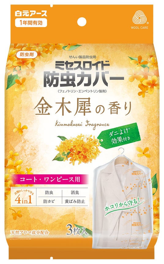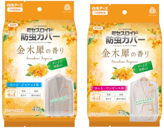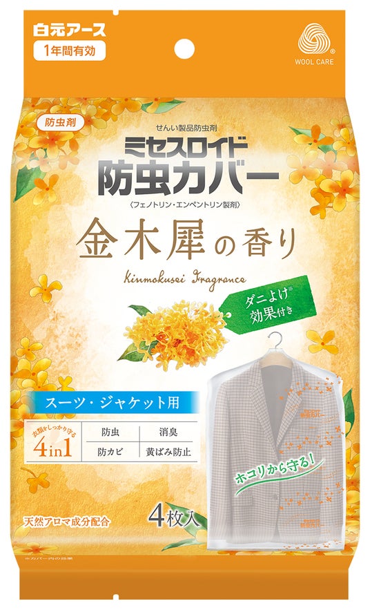 そこで、好評をいただいている『ミセスロイド 金木犀の香り』にカバータイプを数量限定で新発売いたします。道端でふわっと香る、甘くて心地よい金木犀の香りが衣類をやさしく包みます。また、大切な衣類を守る「防虫」「消臭」「防カビ」「黄ばみ防止」の4つの機能と、「カバー内のダニよけ効果※」を搭載した多機能タイプとなっています。さらに、カバー両面に通気性の高い不織布を採用し、使用中に湿気がこもりにくくなっています。パッケージは金木犀の良い香りを想起させるノスタルジックな雰囲気のデザインを採用しました。ラインナップは「スーツ・ジャケット用4枚入」「コート・ワンピース用3枚入」の2種類で展開します。※屋内塵性ダニに対する効果