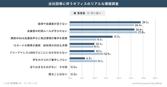 ・出社回帰で最も課題に感じている項目は、管理者が「座席や会議室が足りない」29.1%、