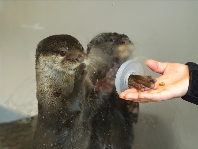 「HANA・BIYORI」に暮らしているコツメカワウソたちは、可愛らしい姿やしぐさが来園者に大人気です。えさやり体験会の参加者は、コツメカワウソたちがその器用な手を使って一生懸命えさをつかみ、夢中で食べる姿を間近でご覧いただけます。