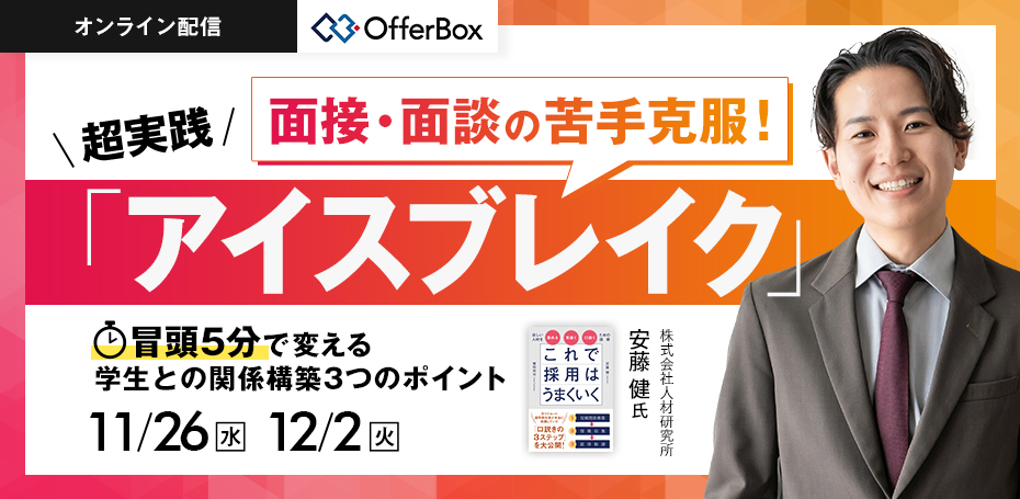 学生と企業をつなげる新卒オファー型就活サービス「OfferBox(オファーボックス)」を運営する株式会社i-plug(本社:大阪市淀川区、代表取締役 CEO:中野智哉)は、人事担当者を対象とするセミナー「面接・面談の苦手克服! 超実践『アイスブレイク』冒頭5分で変える 学生との関係構築3つのポイント」を11月26日(水)と12月2日(火)にオンラインで開催します。