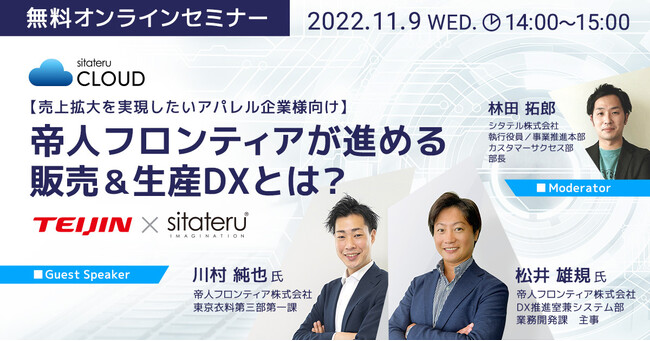 衣服・ライフスタイル産業が抱える社会課題を解決するクラウドサービス「sitateru CLOUD」を提供するシタテル株式会社(本社:熊本県熊本市、代表取締役:河野秀和、以下シタテル)は、帝人フロンティア株式会社と共催で、売上拡大を実現したいアパレル企業様向けに、無料オンラインセミナー「 帝人フロンティアが進める販売&生産DXとは?」を11月9日(水)に開催いたします。