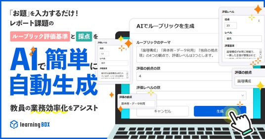 learningBOX株式会社(本社:兵庫県たつの市、代表取締役:西村洋一郎)は、2024年12月11日(水)にeラーニングシステム「learningBOX」(ラーニングボックス)において、ルーブリック評価基準をAIで自動生成し、採点まで行う新機能をリリースします。近年、アクティブ・ラーニングなど主体的な学びを評価する方法として「ルーブリック評価」が注目されていますが、その作成と採点には手間がかかり、教員の業務負担の増加が課題となっています。本機能は、レポート課題の評価基準作成・採点による教員の業務負担を大幅に軽減するだけでなく、評価の透明性と公平性も担保します。日本製eラーニングシステムでルーブリック評価をAIで自動生成できる機能実装は現時点では珍しく、教育現場だけでなく企業の研修にも応用できるこの新機能で、教育DXを一歩先へと推進します。