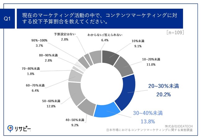「Q1.現在のマーケティング活動の中で、コンテンツマーケティングに対する投下予算割合を教えてください。」(n=109)と質問したところ、「20~30%未満」が20.2%、「30~40%未満」が13.8%という回答となりました。