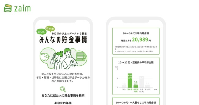 くふうグループにおいて、1,000 万ダウンロードを超える個人向け家計簿サービス「Zaim」を運営する株式会社 Zaim(本社:東京都港区・代表取締役:閑歳 孝子)は 2022 年 5 月 25 日、コロナ禍後のユーザーの家計簿の統計データから属性別の預貯金の平均などを算出できる「みんなの貯金事情」(https://content.zaim.net/savings)の提供を開始しました。