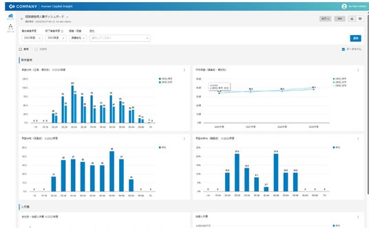 人事基幹システムと一体化した「COMPANY」のタレントマネジメントシステムも併せて利用することで、人事・給与・勤怠・評価などが同一データベースで管理されるため、データの加工や連携作業不要で、常に最新の人的資本データをリアルタイムで可視化・分析できるようになります。法令対応に必要な開示指標に加え、多様性や人材流動性(採用・離職など)に関する指標も、標準機能として実装されているため、即座にダッシュボード上へ表示できます。