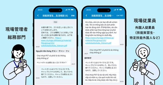 『カミナシ 従業員』チャット機能の画面(イメージ)。送信者が発信したメッセージは、受信者側では受信者が設定した言語に自動翻訳されるため、異なる言語を使用する従業員同士でもスムーズに意思疎通を図ることができる