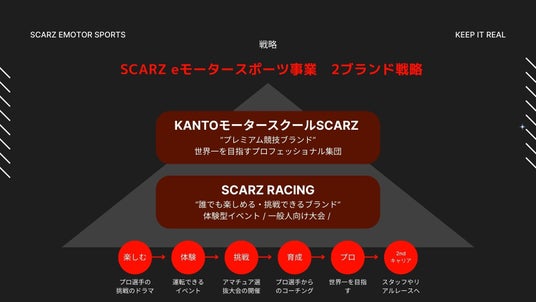 SCARZのeモータースポーツ事業は、世界を目指すトップチームである「KANTOモータースクールSCARZ」を頂点としつつ、eスポーツならではの「誰でも挑戦できる」魅力を広げるブランドとして「SCARZ Racing」を展開します。