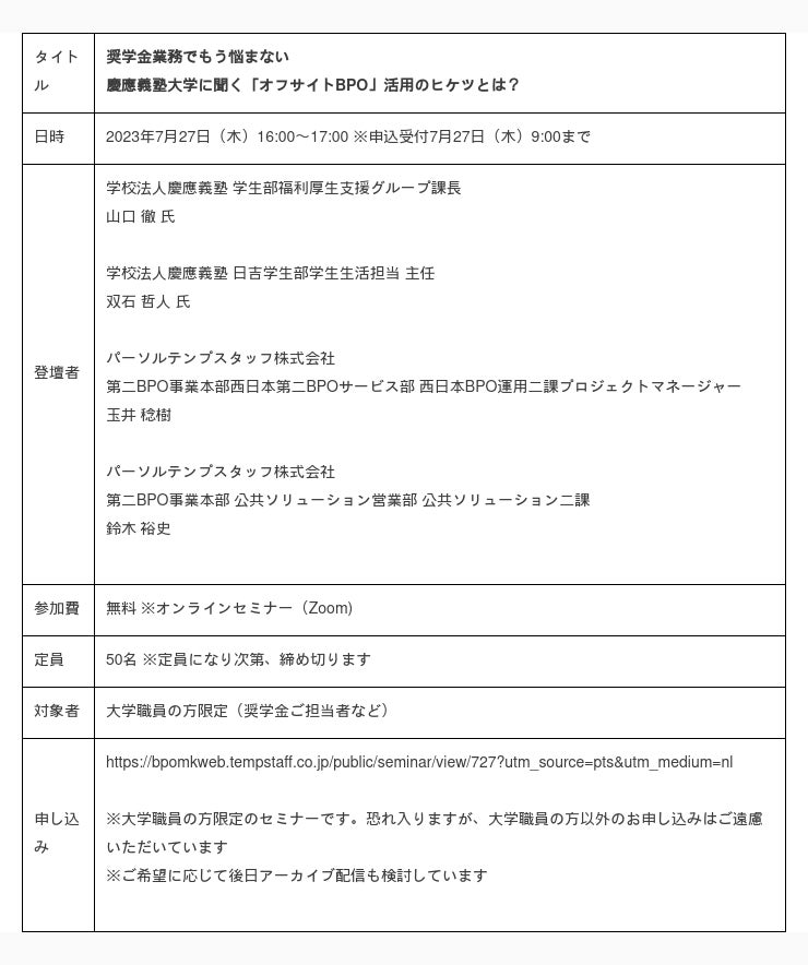 今回のセミナーでは、「大学内での業務負担」をオフサイトサービスによって解消した慶應義塾大学のご担当者様に登壇いただき、アウトソーシング活用のヒケツをお伺いします。