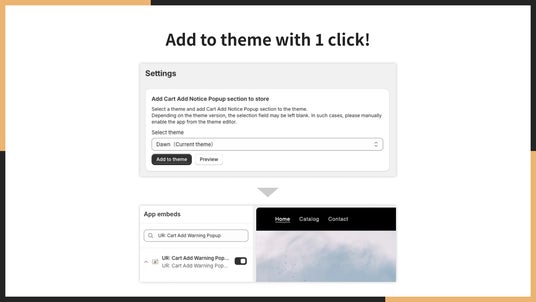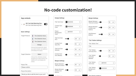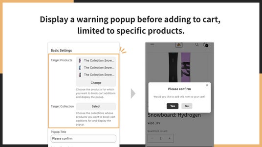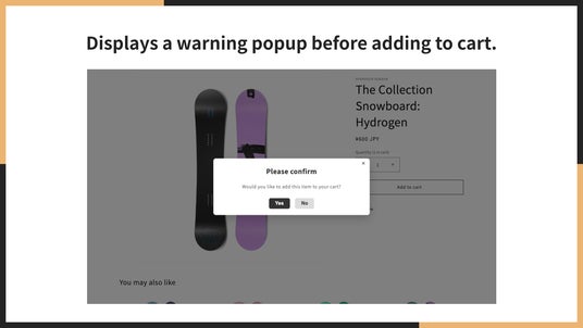 「UR: Cart Add Warning Popup」は、購入者が商品をカートに追加する前に注意事項や免責事項、特別なオファーなどを確実に表示できるアプリです。コード編集は不要で、ポップアップのテキストやデザインを自由にカスタマイズ可能です。誤解やトラブルを未然に防ぎながら、ブランドイメージに合わせた重要情報を効果的に伝えることができます。