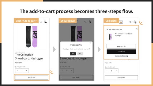 通常 1 ステップで完了するカート追加を、「注意喚起 → 同意」を挟む3 ステップフローに変更可能。