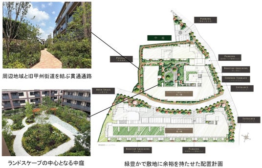 - 住民の憩いと交流の場となる「中庭」をランドスケープの中心に据え、最大3.8m幅の歩道状空地など、ゆとりある計画