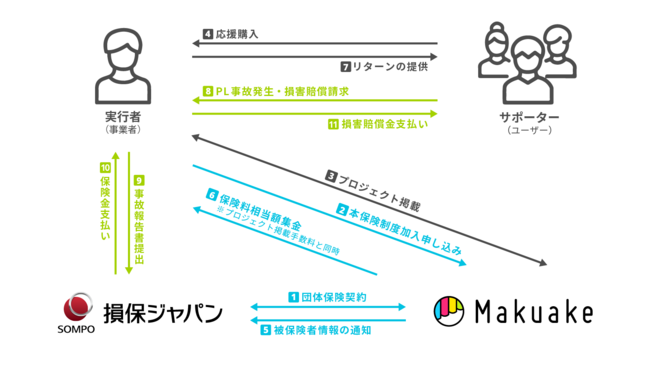 マクアケの提供する応援購入サービス「Makuake」は、購入型クラウドファンディングの仕組みをベースとし、掲載されている事業者のプロジェクトの新商品・新サービスを応援購入したユーザー(サポーター)に対し、事業者がプロジェクトにて実現したもの・体験をお返しするサービスを提供するプラットフォームです。市場規模拡大の影響もあり、事業者は「Makuake」を活用することで今までにない新商品・新サービスを早く、広く発信することができる一方、プラットフォーマーとしてユーザーが抱えるリスクに対してどこまで関与するかは議論されていました。また、事業者側としてもグローバル化によりユーザーが日本に限らず拡大していく中で、今までにない新しいものを対象とした損害保険商品の手配に関して商品面、コスト面で課題が発生する可能性があり、市場のさらなる拡大の観点も踏まえてプラットフォーマーの関与が必要と認識し、マクアケと損保ジャパンは検討を2021年に開始しました。