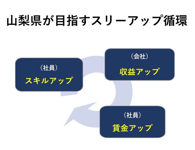 豊かさ共創社会の実現に向けて山梨県が目指す姿は、働き手のスキルアップが企業に生産性向上と収益をもたらし、その成果を賃上げにより働き手に還元するという好循環サイクル(=スリーアップ循環)の実現であります。