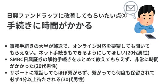 さらに「手続きに時間がかかる」点も複数の投資家から指摘されており、「オンラインで手続きできるようにしてほしい」などの要望が目立った。
