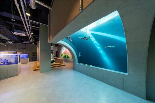 やわらかな自然光が降り注ぐオーバーハング水槽が印象的なゾーン「FOYER 探求の室」を全面改装。ピラルクやアロワナなど、魚たちが泳ぐ水槽はそのままに、ゾーンの壁面が書棚で埋め尽くされます。