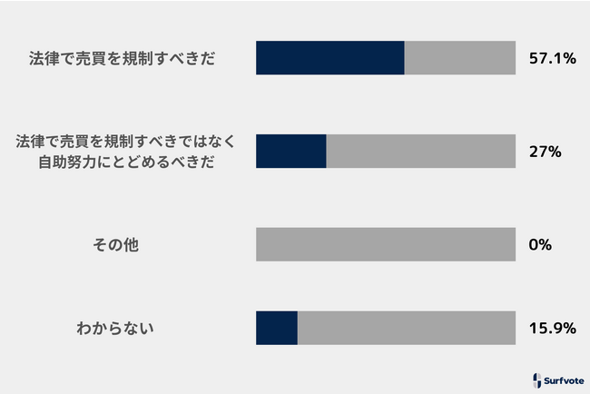 「法律で売買を規制すべきだ」が57.1%で最も多い回答。次いで、「法律で売買を規制すべきではなく、自助努力にとどめるべきだ」27%。「その他」15.9%。