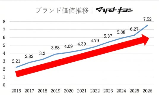 当ランキングにおいて、「マツモトキヨシ」のブランド価値は、昨年の6.27億ドルから7.52億ドルと大きく拡大し、11年連続のランクインとなりました。また、前年度からのブランド価値成長率は+20%となりました。