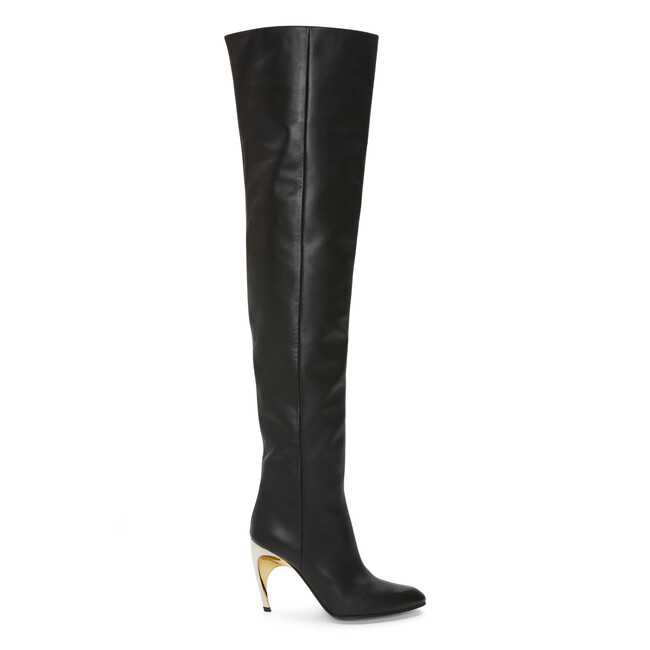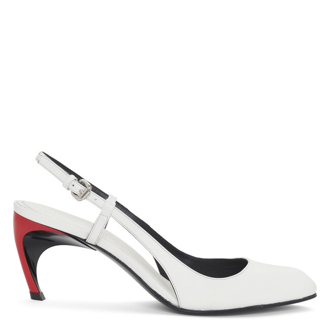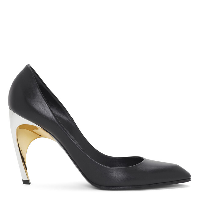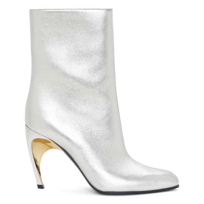ポインテッドトゥのアンクルブーツとサイハイブーツは、ブラックとシルバーのレザーにコントラストカラーをきかせたカーブヒールがデザインされ、アルマジロミュールとパンプスはブラックとホワイトのレザーで展開。
